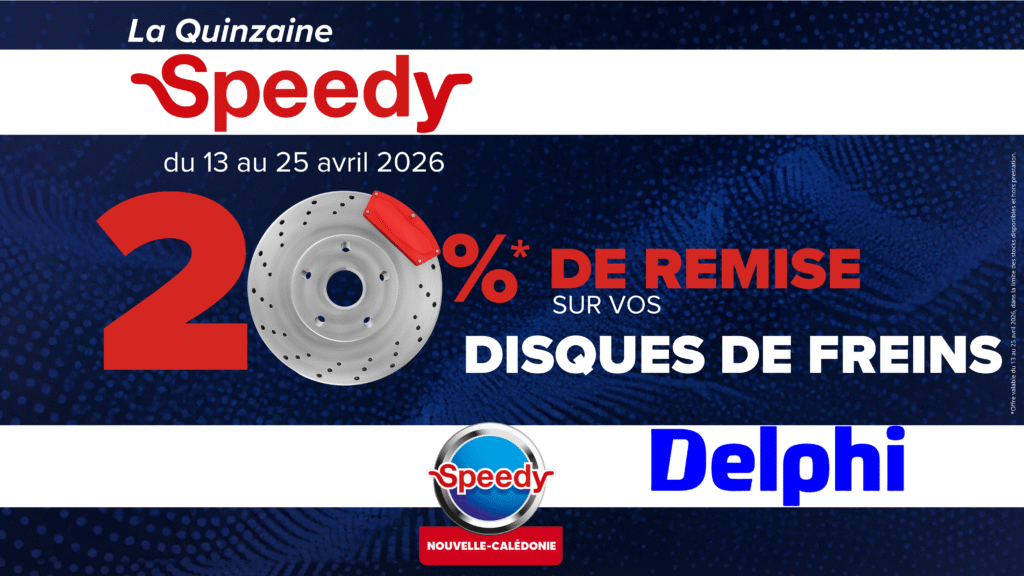 Speedy Nouvelle-Calédonie. À l’occasion de la Quinzaine Speedy, profitez de 20 % de remise sur les disques de freins Delphi. Diagnostic, remplacement et conseils, tout est pris en charge pour rouler en toute sécurité. Retrouvez votre centre à N’Géa, PK4, Dumbéa ou Ducos, avec ou sans rendez-vous. Plus d’informations sur leur page Facebook ou sur le site speedy.nc.